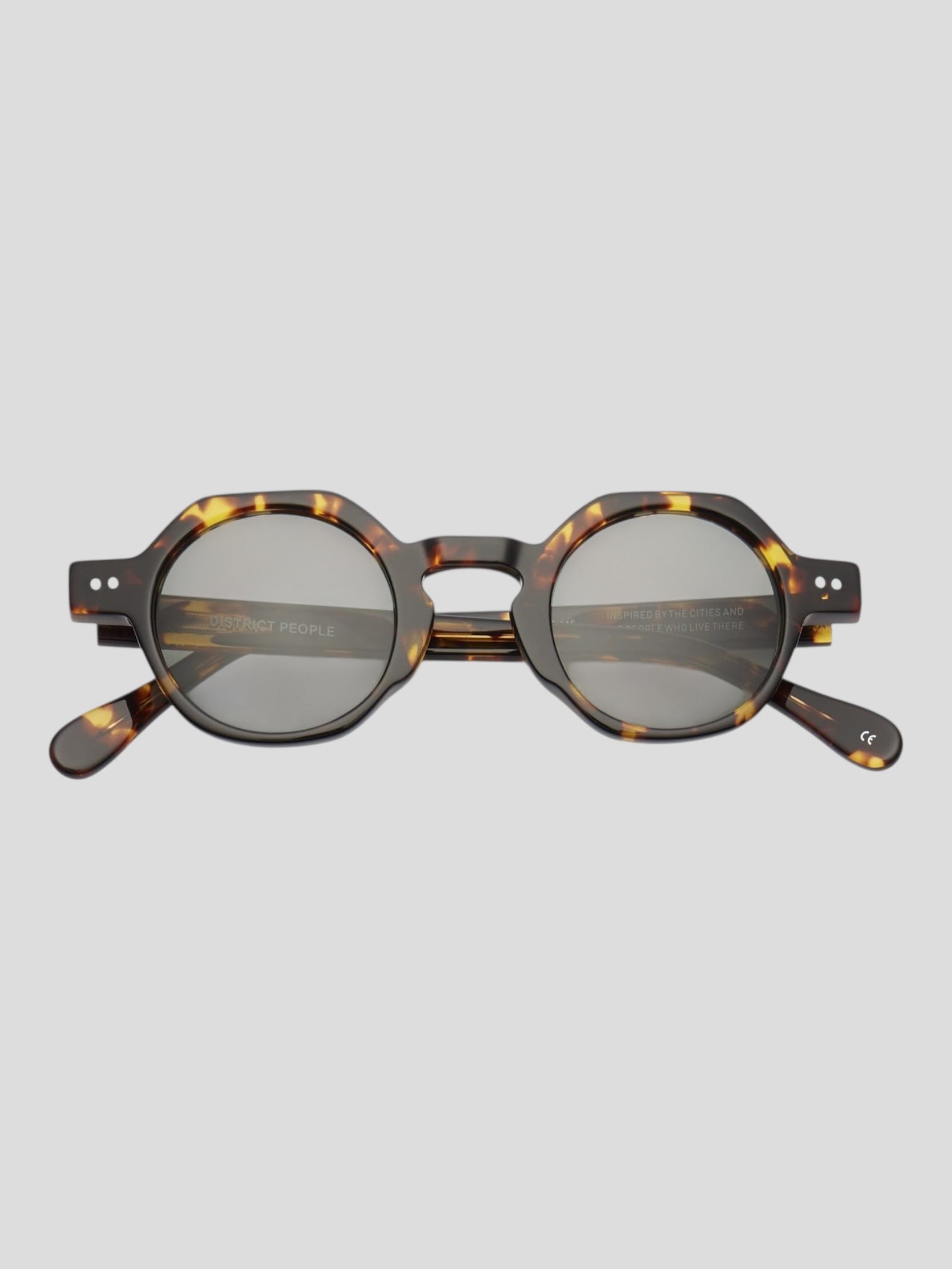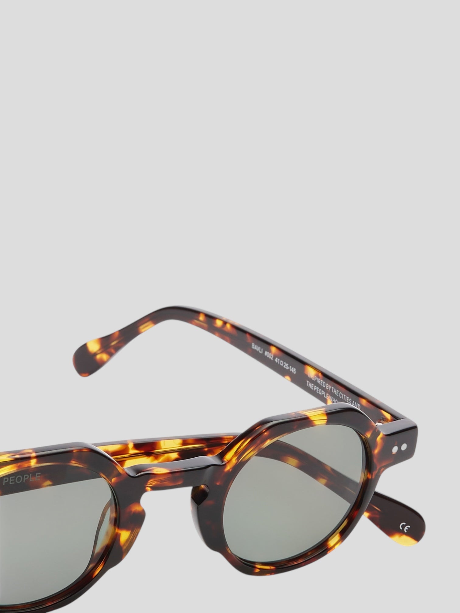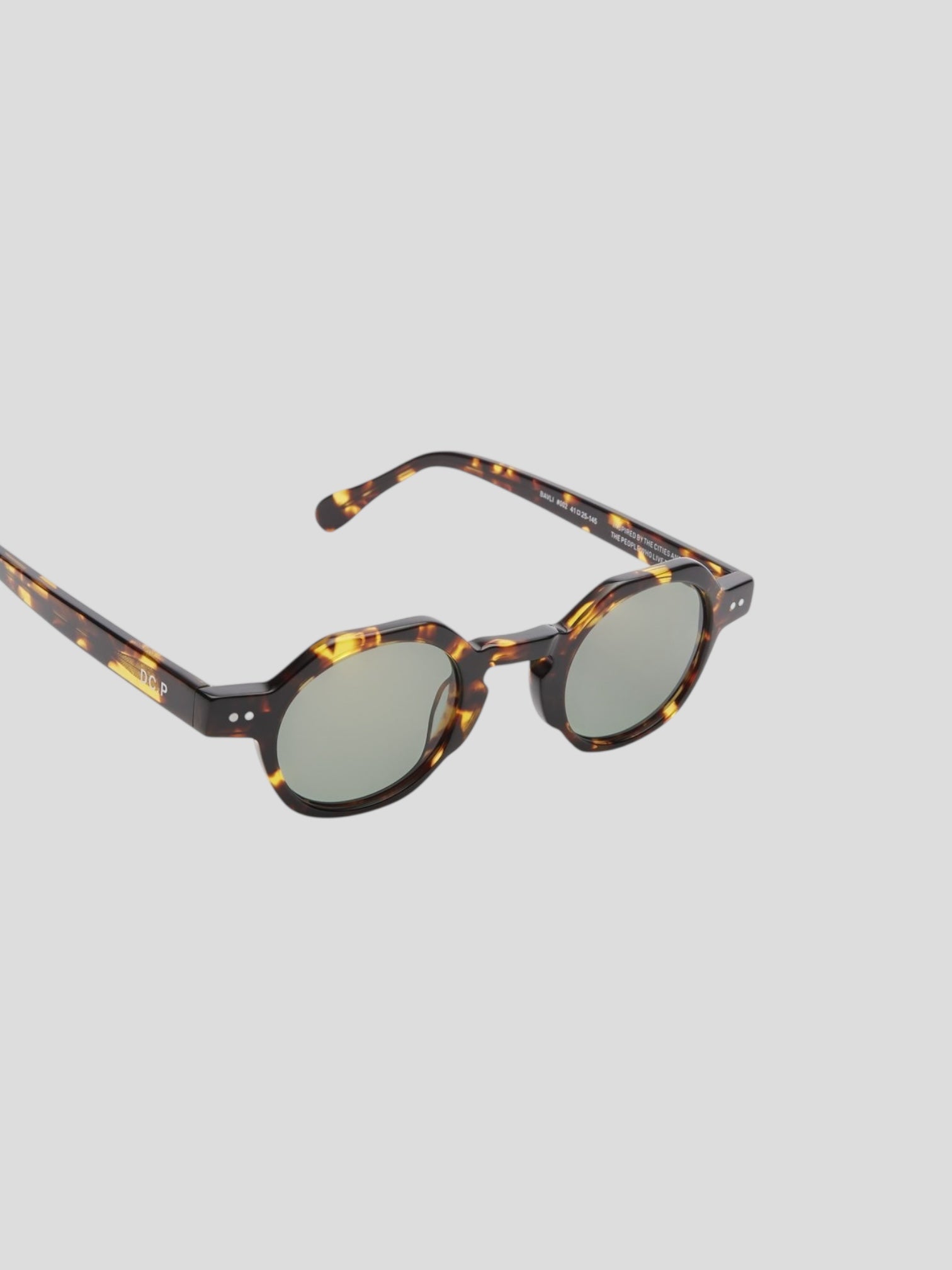 Occhiali da sole dal design essenziale con montatura in acetato italiano Mazzucchelli finitura Havana e lenti verdi CR39. Linee pulite e carattere quotidiano, designed in Italy.