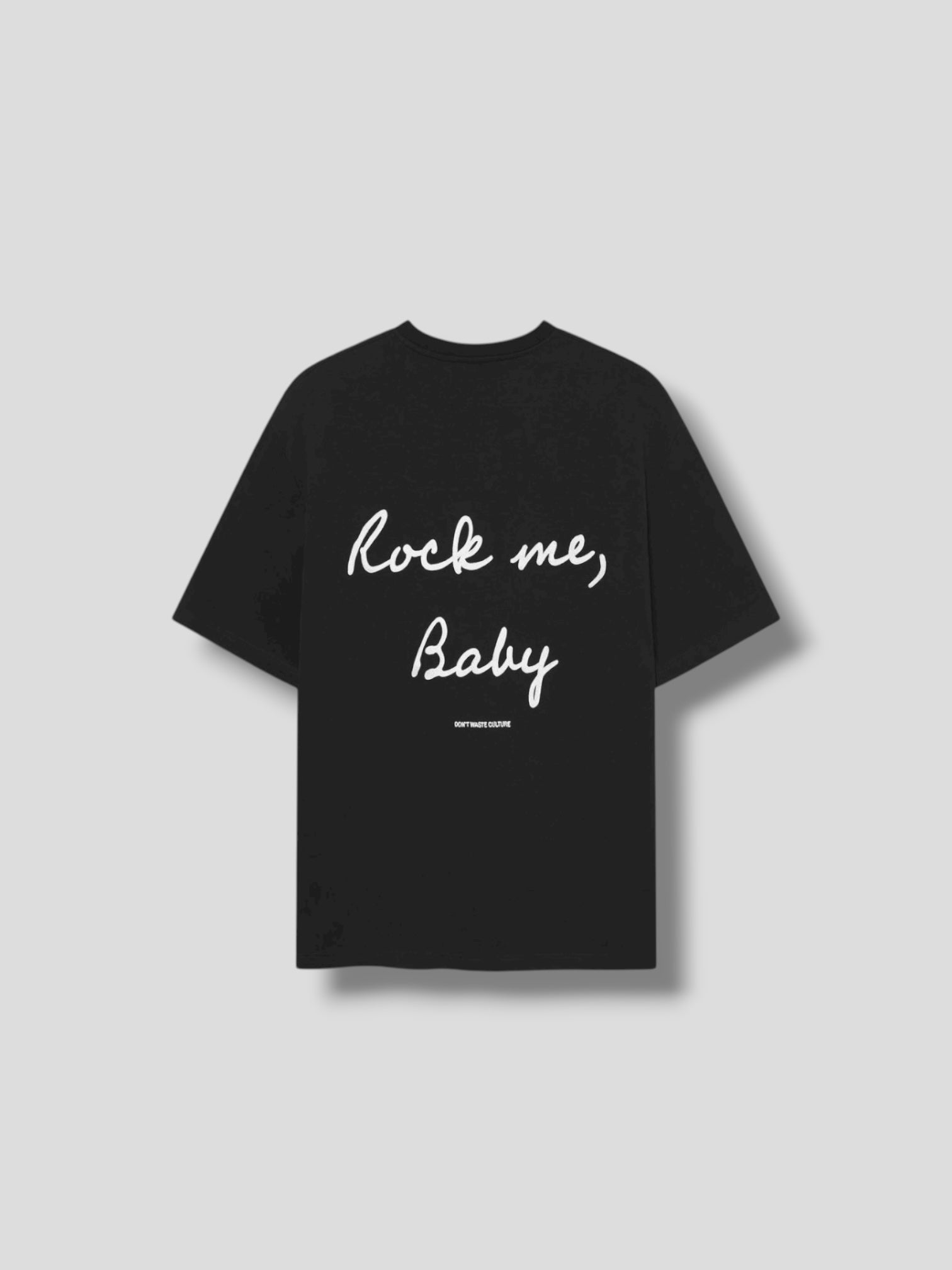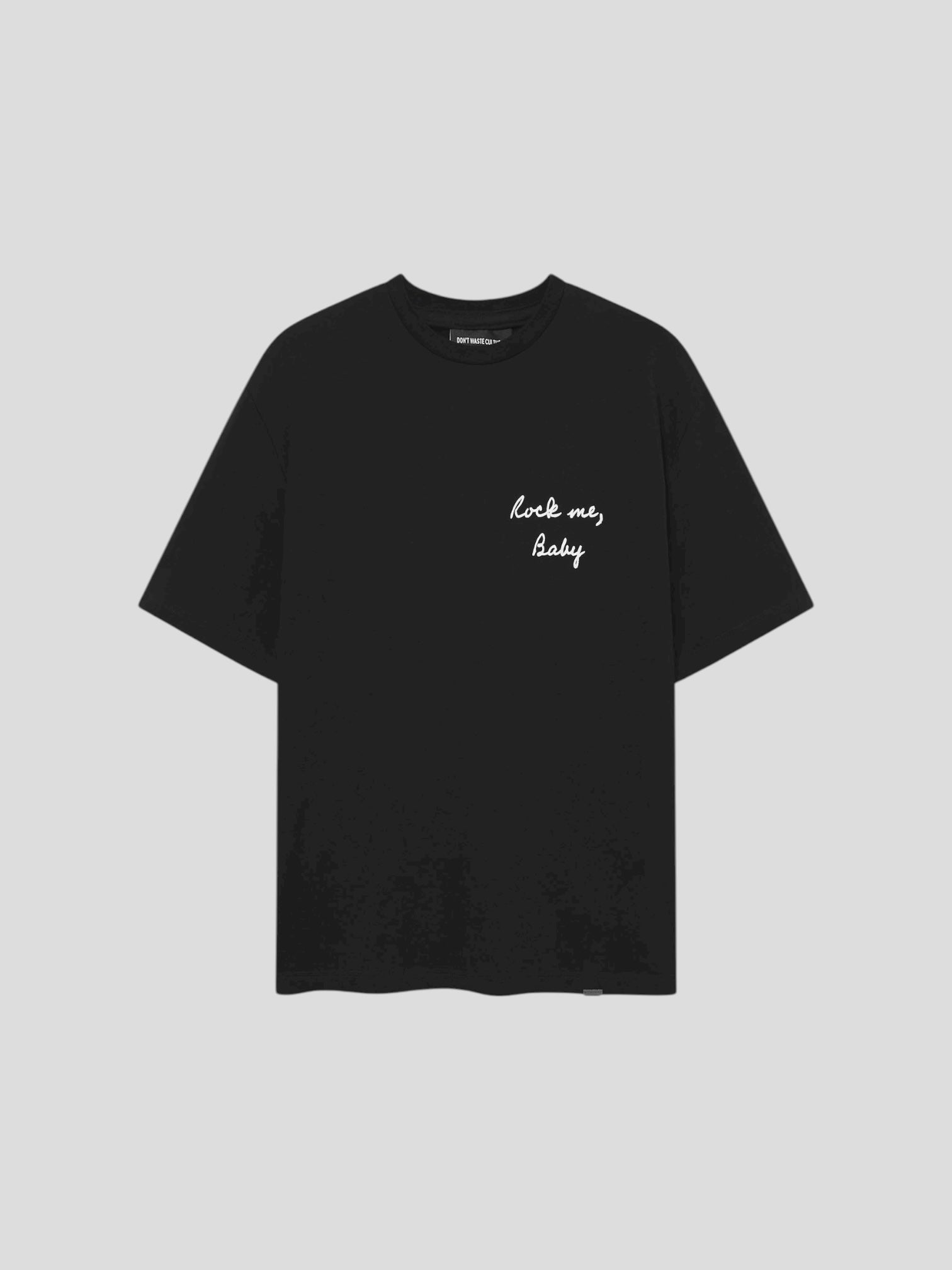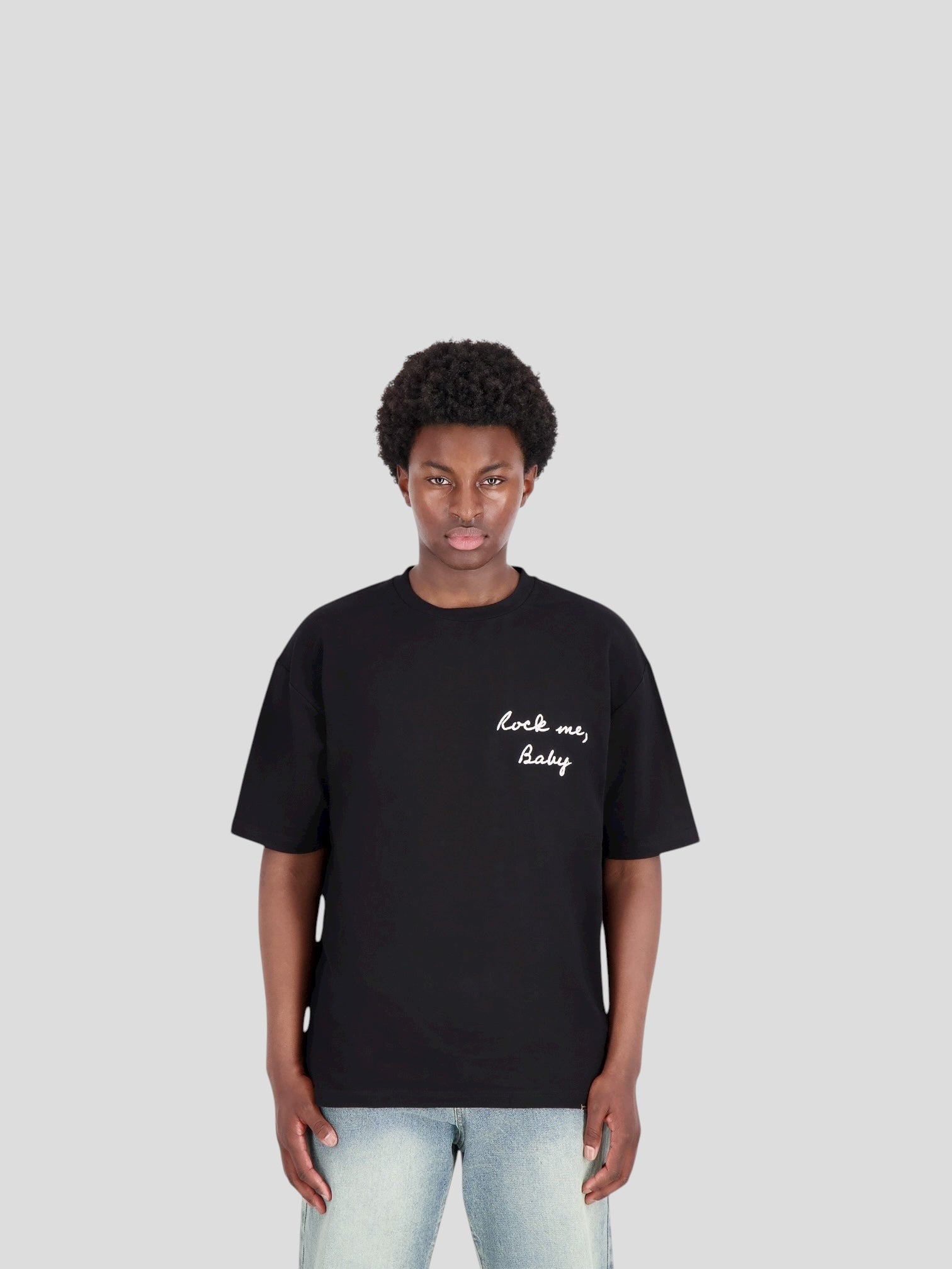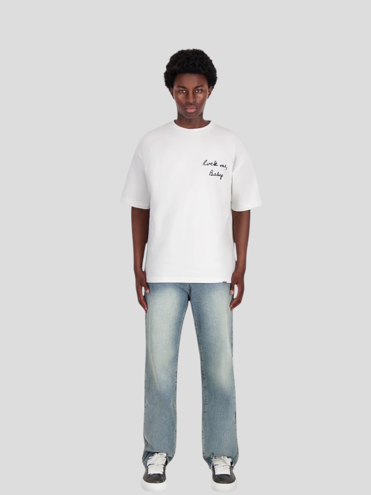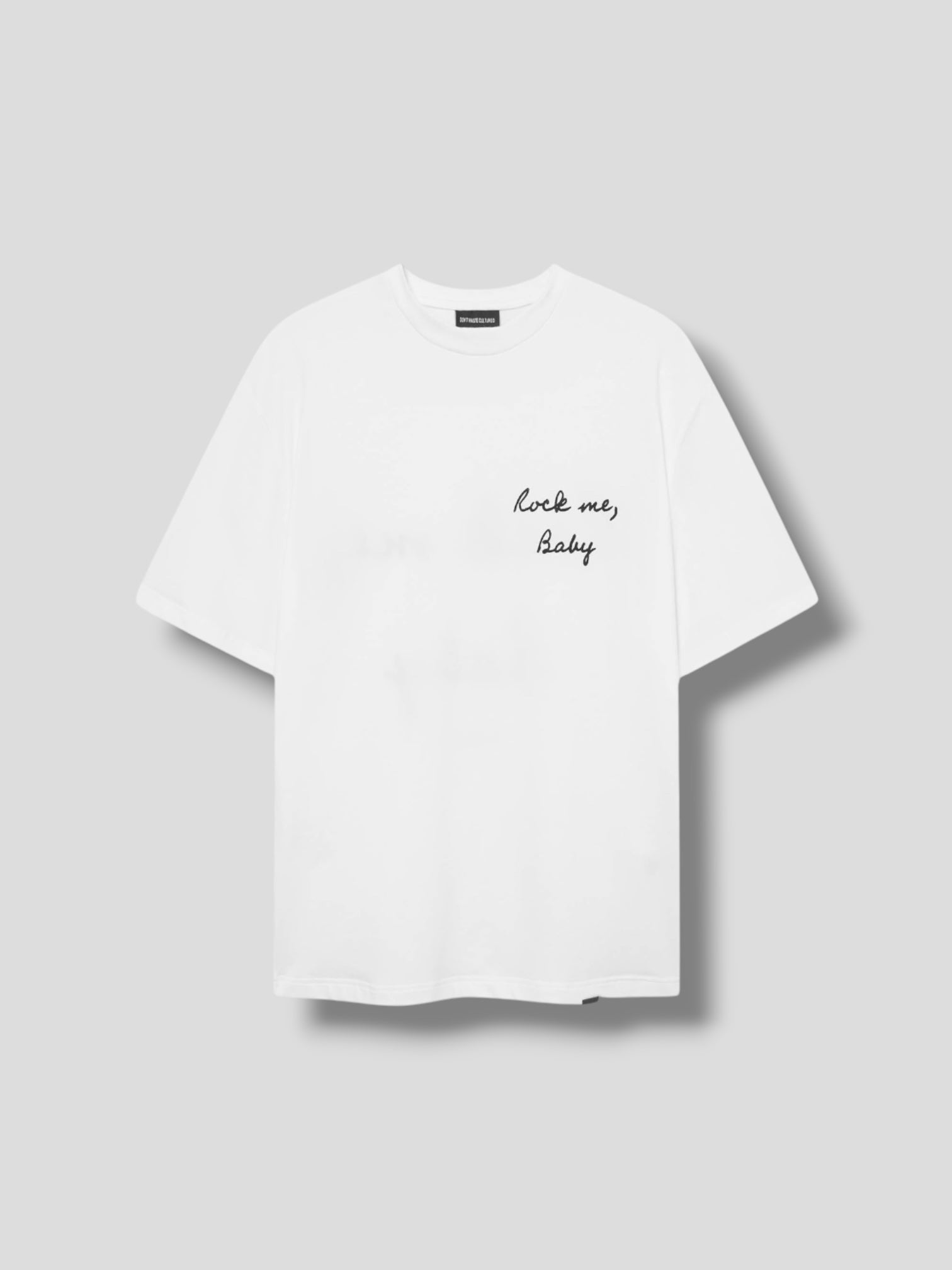 T-shirt premium in cotone pesante, con ricamo a catena “Rock Me Baby” che unisce streetwear e artigianalità. Taglio pulito e versatile, perfetta per un look urbano di carattere.