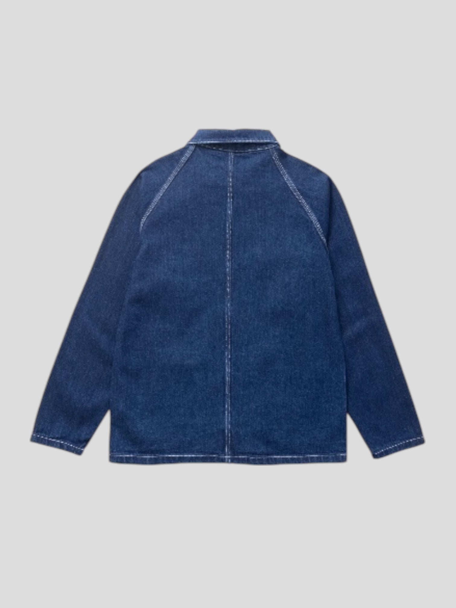 Coverall in denim 12oz cotone organico GOTS con vestibilità regolare. Cuciture triple a contrasto, maniche raglan, costruzione a 4 tasche e chiusura a 5 bottoni. Un classico workwear pulito e funzionale.