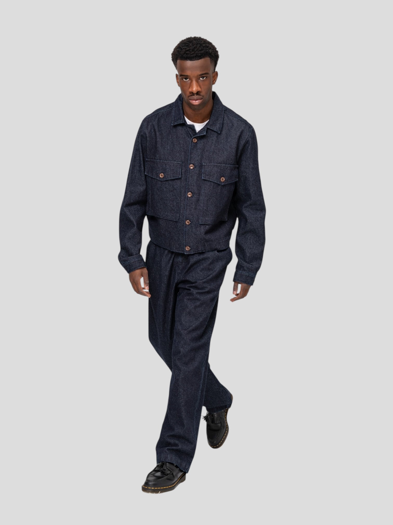 Giacca in denim Pianeta non foderata, dal taglio pulito e contemporaneo. Il design minimal è completato da due ampie tasche a pattina sul petto e da un leggero elastico sul retro che definisce la linea.