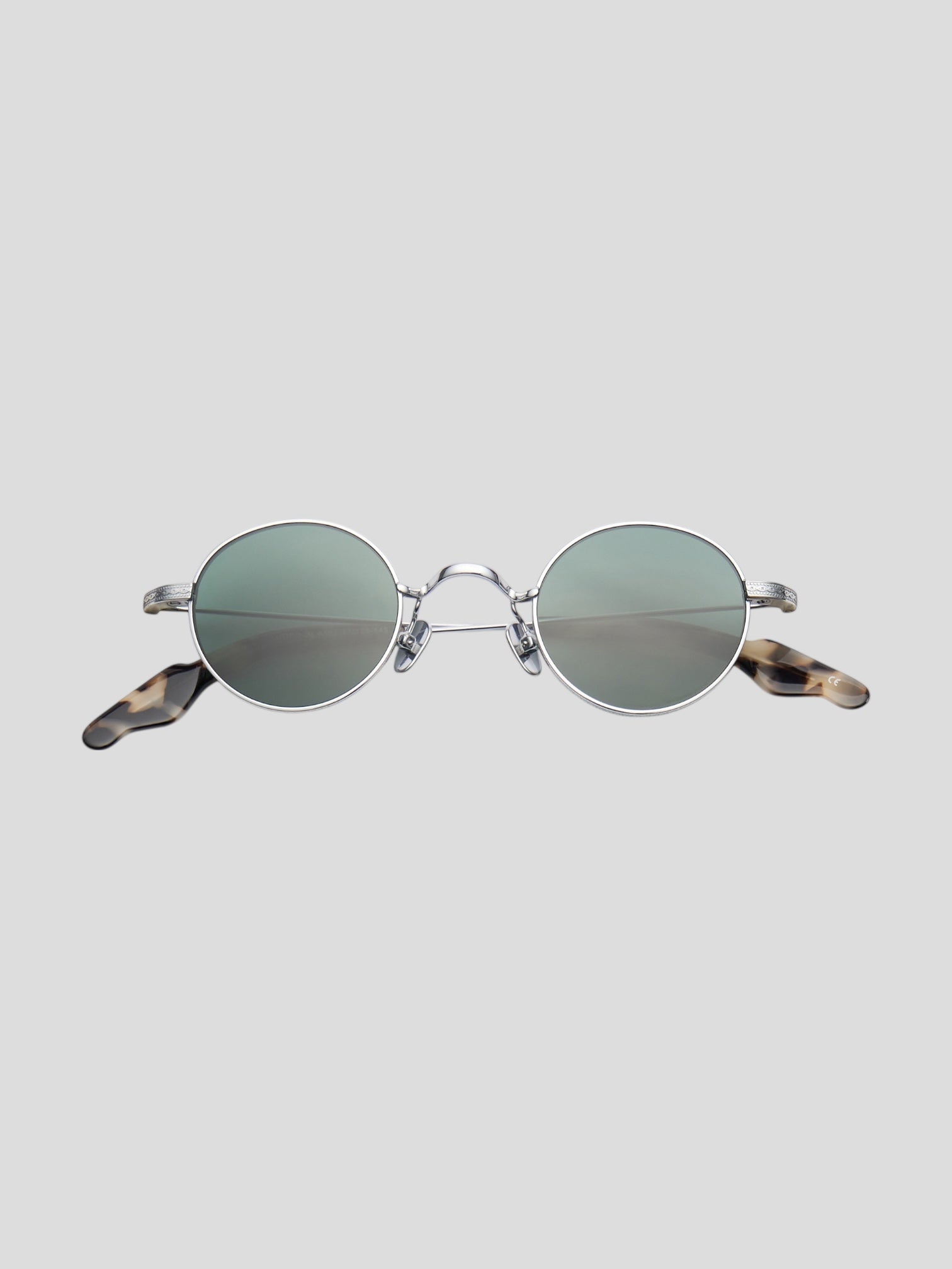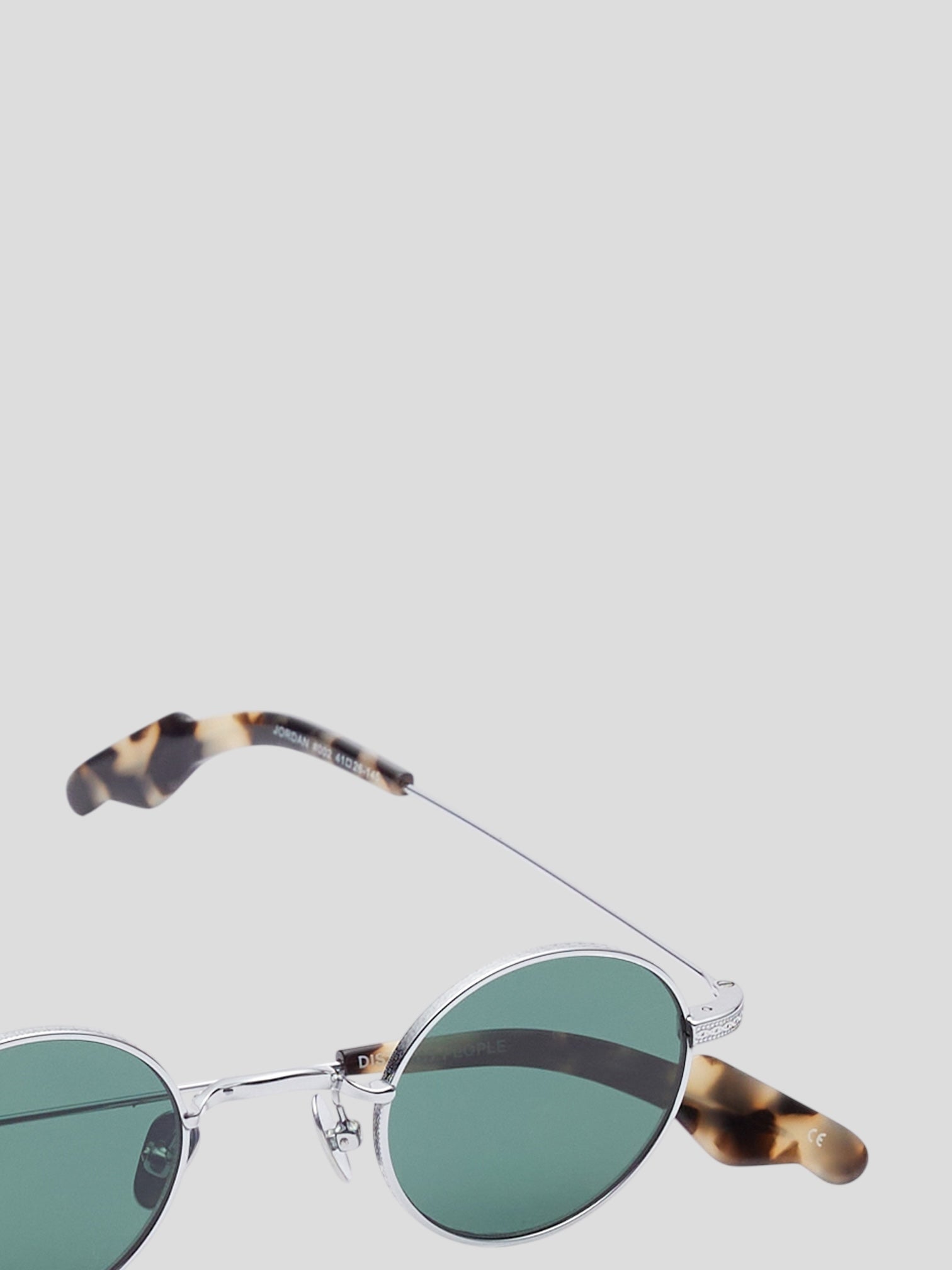 Occhiali da sole dal design essenziale con montatura in metallo finitura argento e lenti verdi in nylon. Leggeri e lineari, perfetti per un look contemporaneo quotidiano.