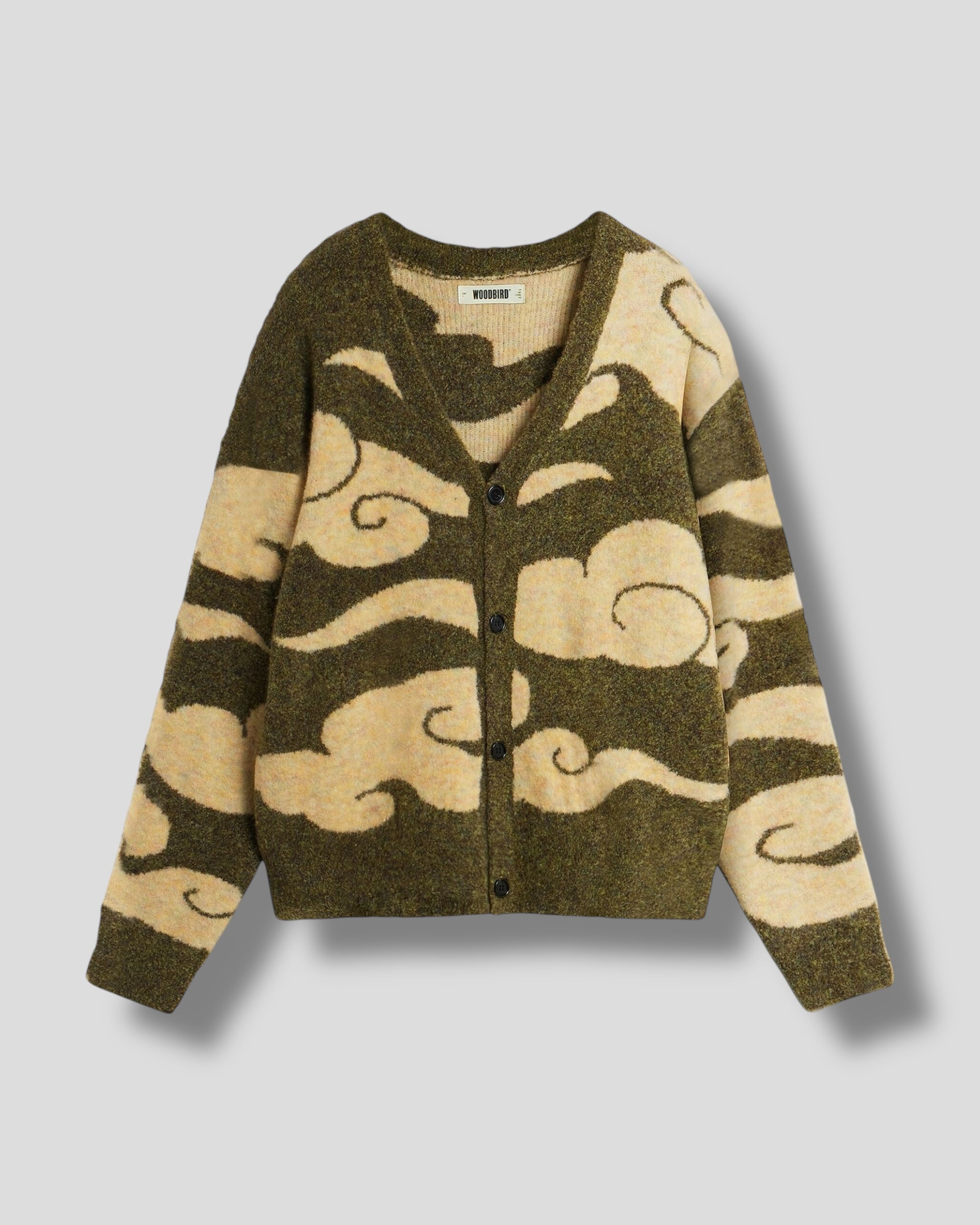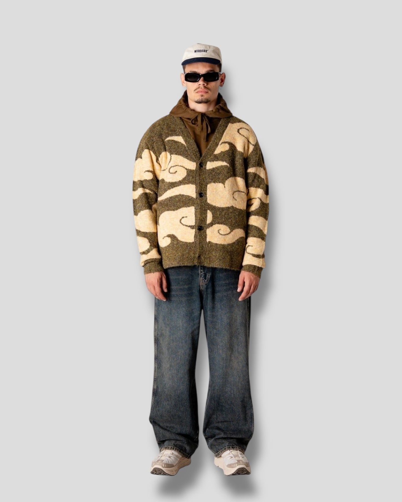 Cardigan unisex dalla texture spazzolata e motivo “cloud” fluido che unisce comfort e stile.
