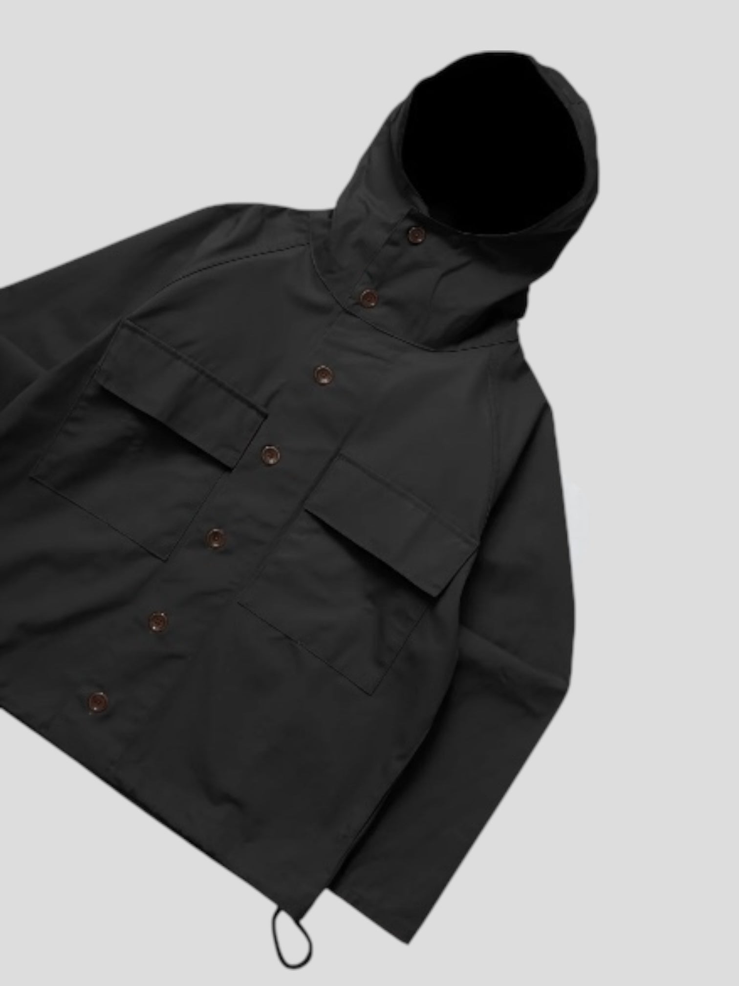 Parka in twill di cotone cerato organico GOTS (240 gsm) con chiusura a bottoni e cappuccio smock. Doppie tasche sul petto con bottoni a pressione e coulisse regolabile in vita: un classico workwear funzionale per l’uso quotidiano.